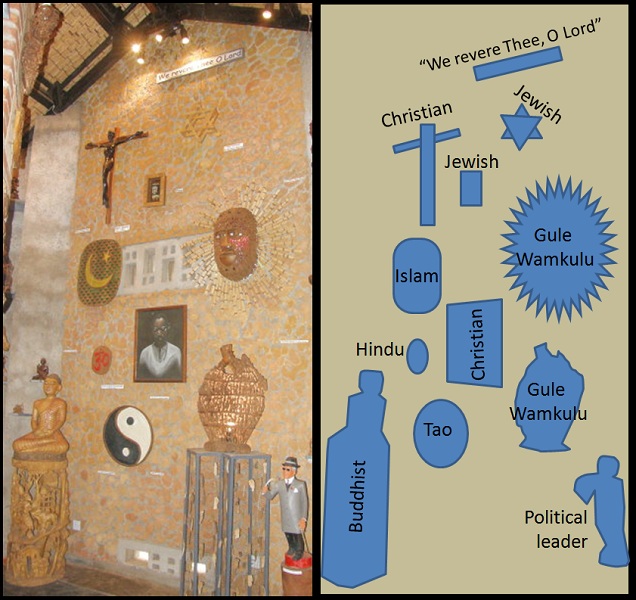 Based on this display in their art gallery, it seems that the world view presented at KuNgoni Cultural Centre is that all paths, including Gule Wamkulu, lead to the same God.